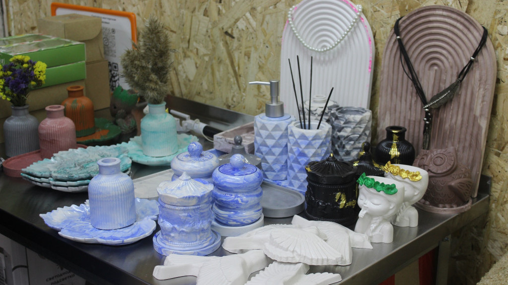 У Евгении работа более ювелирная: залить состав в форму, добавить пигмент и отправить будущее изделие на многоступенчатую обработку. Вода и гипс идут в строгом соотношении. Смесь должна иметь консистенцию сметаны. Если влаги больше, то гипс будет дольше застывать, а вещь окажется хрупкой.