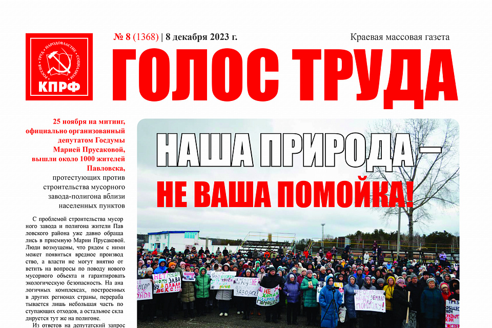8 декабря из печати вышел очередной выпуск краевой общественно-политической газеты «Голос труда».