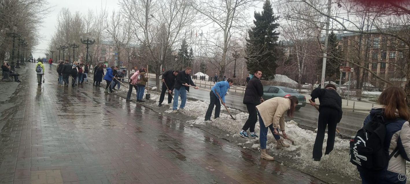Сегодня учащиеся Алтайского государственного медицинского университета проводили работы по ворошению снега на аллее по проспекту Ленина на участке от улицы Чкалова до улицы Димитрова.