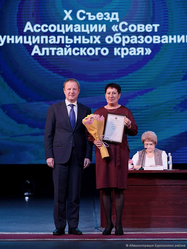 Губернатор Алтайского края Виктор Томенко наградил Благодарственным письмом главу Ореховского сельсовета Марию Швец в рамках прошедшего накануне в Барнауле десятого, юбилейного, съезда ассоциации «Совет муниципальных образований Алтайского края».