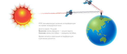 Телевизионный сигнал распространяется по стране через спутники связи, висящие на геостационарных орбитах, расположенных в экваториальной зоне. Весной, когда Солнце смещается из Южного полушария в Северное, на несколько минут в сутки оно оказывается ровно позади спутника — на одной линии с приемной земной станцией. Сигналы спутника связи глушатся более мощным электромагнитным излучением светила. Затем благодаря вращению Земли вокруг своей оси космический аппарат уходит из-под «солнечной засветки».