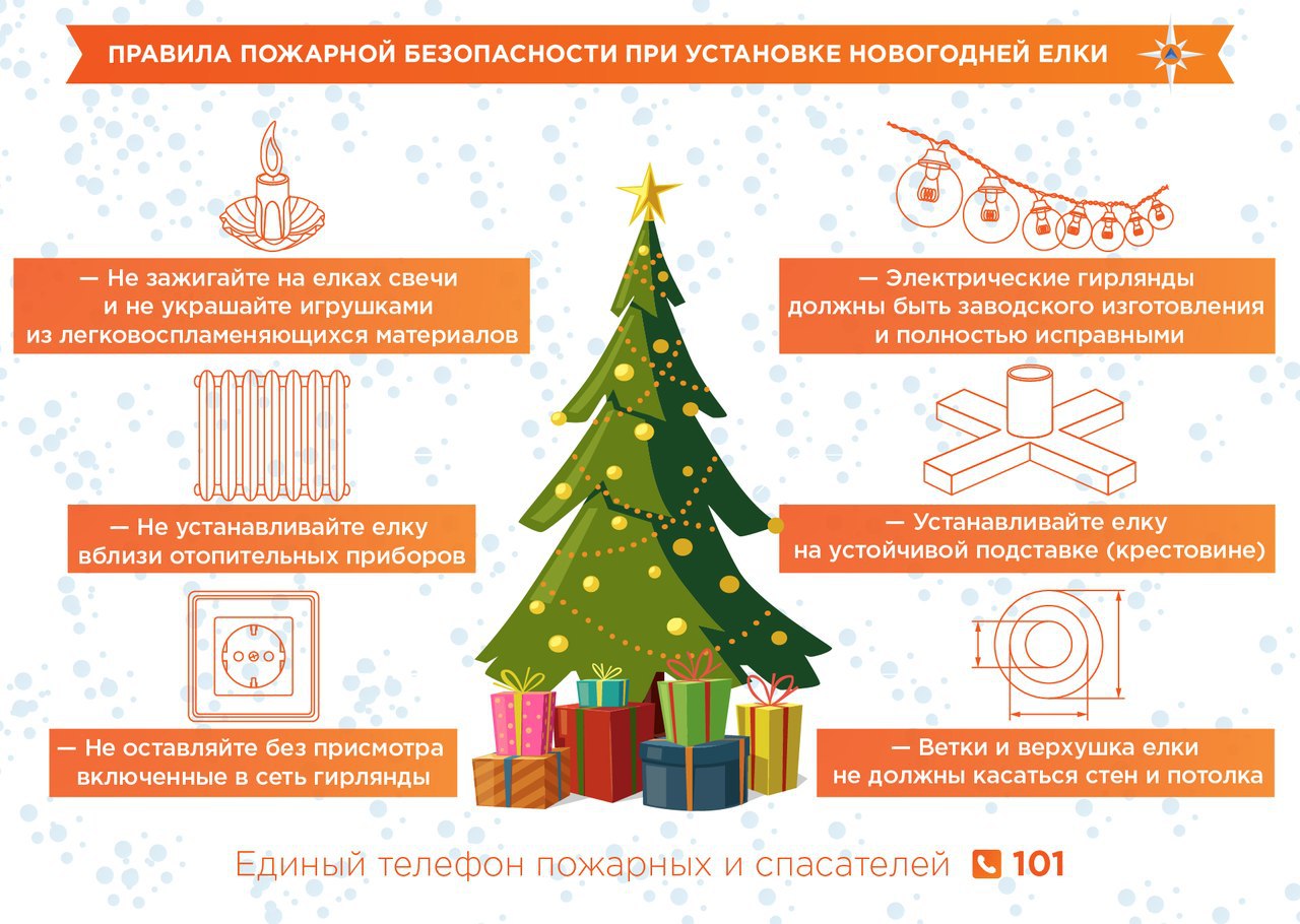 - новогоднюю елку устанавливать на устойчивое основание, она не должна загромождать эвакуационные пути и выходы из помещения. Ветки елки должны находиться на расстоянии не менее 1 метра от стен и потолков, выполненных из горючих материалов, а также приборов систем отопления и кондиционирования.