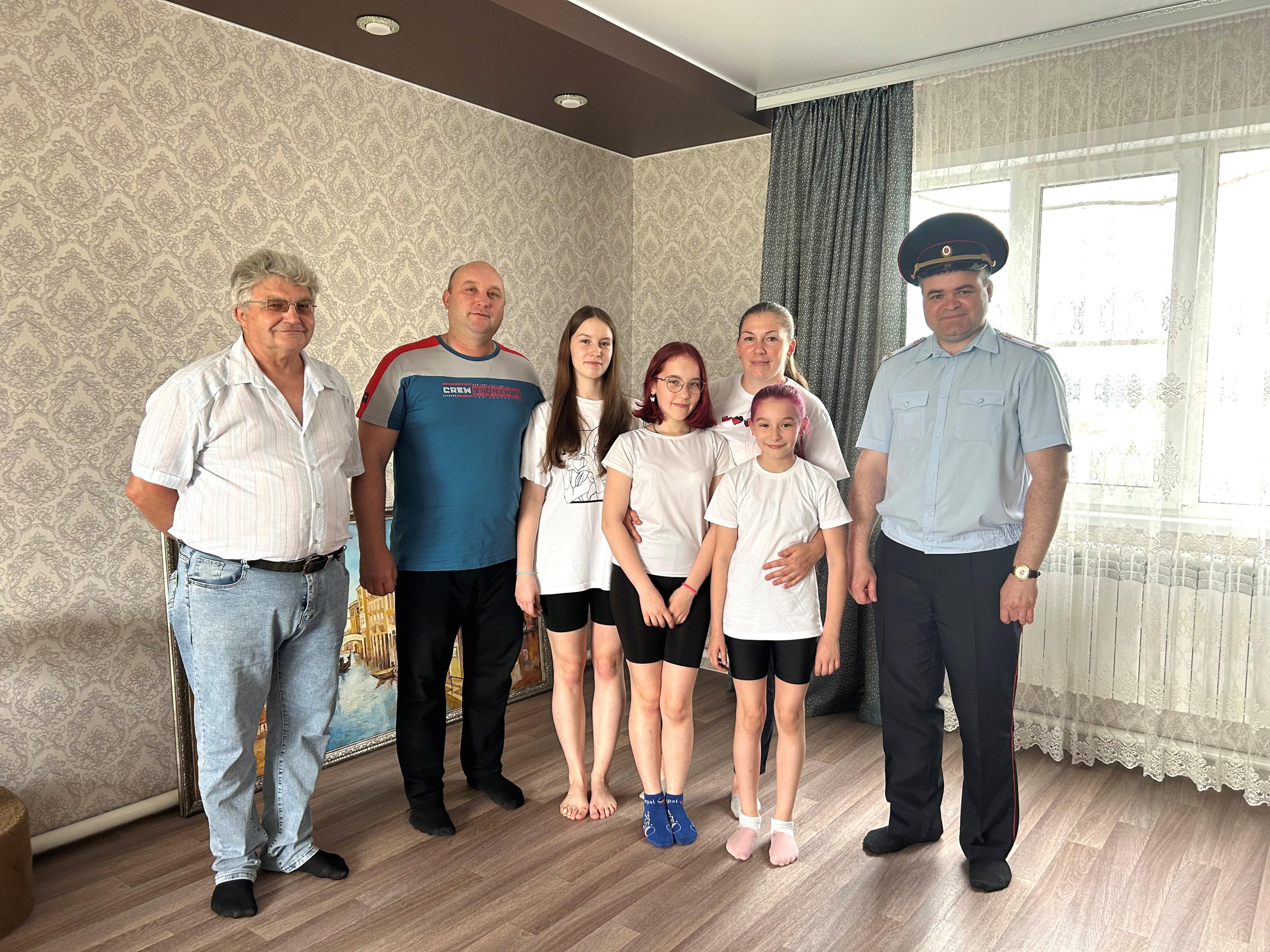Алексей Мостович совместно с начальником ОГИБДД посетил семью Кутняшова Владимира, заместителя командира взвода №1 ДПС МО МВД России «Рубцовский». Владимир и Елена воспитывают трех девочек. Старшей Ольге 17 лет, она в этом году окончила школу и собирается поступать в ВУЗ. 14-летняя Анна и 11-летняя Екатерина обучаются в школе.
