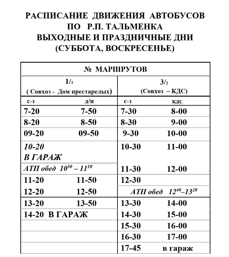 Расписание движения автобусов по р.п. Тальменка в выходные и праздничные дни