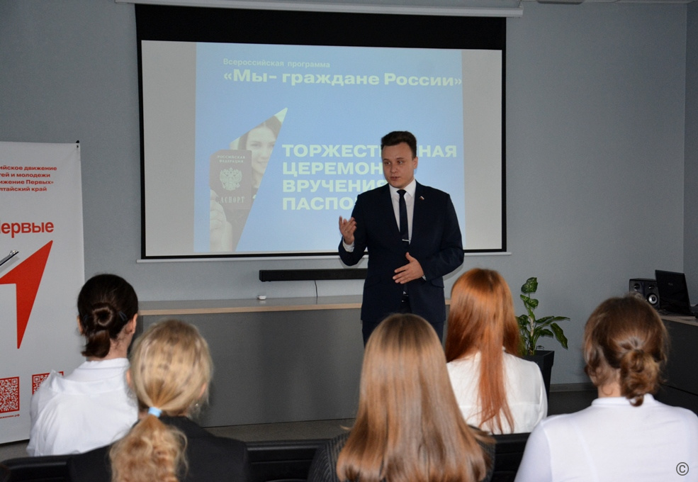 В торжественной обстановке депутат Барнаульской городской Думы Николай Савинский и специалист по организации работы в г. Барнауле регионального отделения Общероссийского общественно-государственного движения детей и молодежи «Движение Первых» Алтайского края Наталья Антипова вручили 14 юным барнаульцам главный в жизни документ.