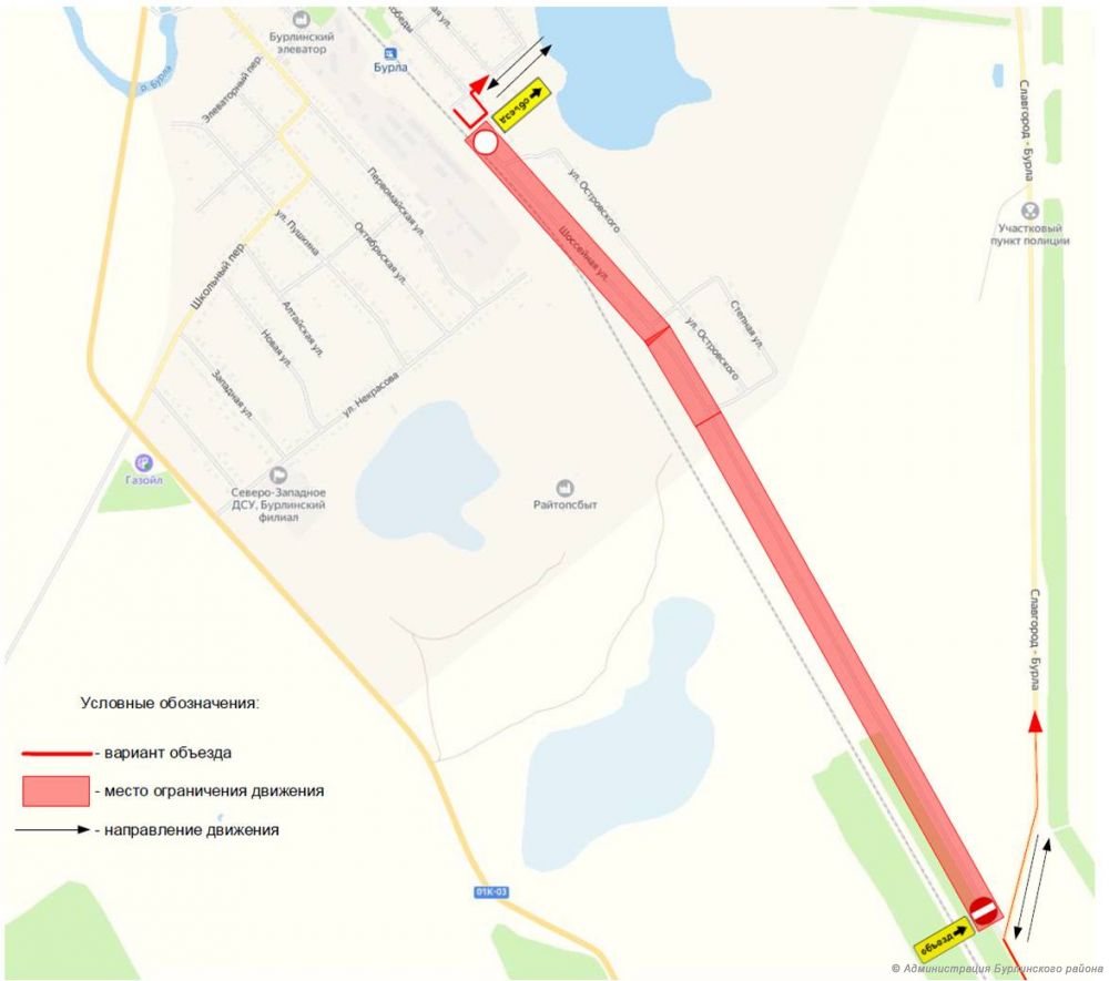 В связи с возможным разрушением дорожного полотна и угрозой безопасности дорожного движения перекрыто движение автотранспорта на автодороге от стелы с названием с. Бурла до въезда на улицу Шоссейная с. Бурла.