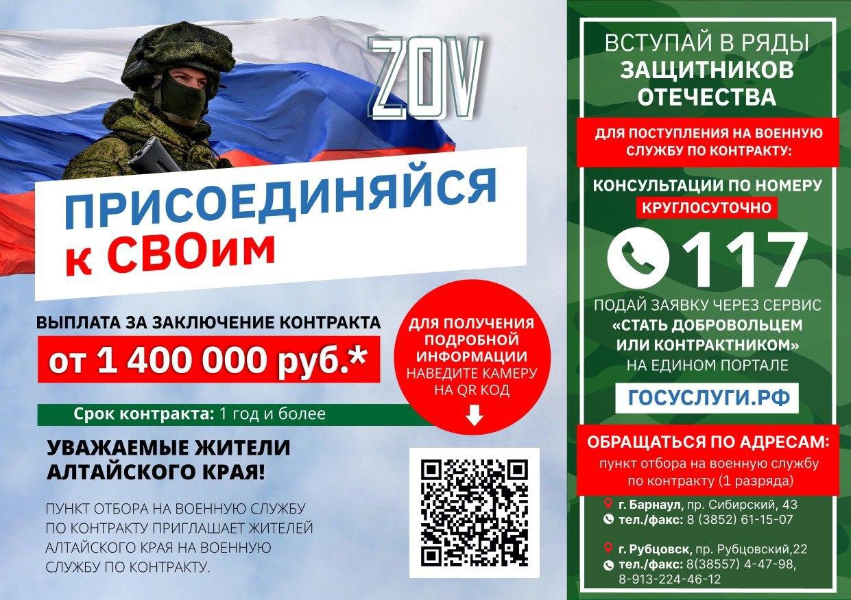 Чтобы поступить на военную службу по контракту, необходимо обратиться в пункт отбора на военную службу или военкомат по месту жительства: - г. Рубцовск, проспект Рубцовский, 22; тел.: +7 (38557) 4-47-98;